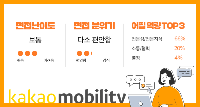 카카오모빌리티 면접은 다소 편안한 분위기에서 진행되었다는 후기가 많았어요. 질문의 난이도는 예측 가능한 수준이라는 평가가 많았고, 직무 역량에 대한 질문이 많았다고 해요. 이력서에 작성한 본인의 경험을 잘 정리해보고, 직무에 대한 이해도를 높이는 것이 중요하다는 의견을 공통적으로 확인할 수 있었어요.