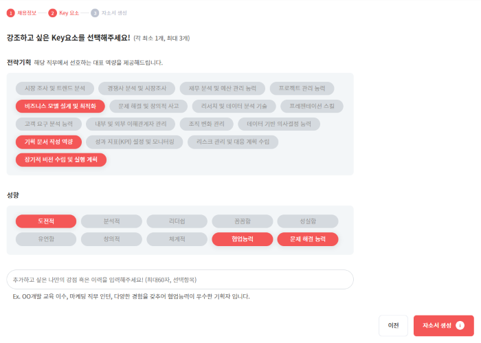👉 채용공고에서 직무 상세와 우대사항을 참고하여 ‘강조하고 싶은 Key요소’를 선택해요.