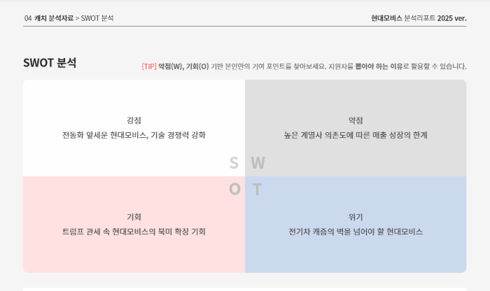 👉 현대모비스의 전략기획 직무는 전략 방향성 제시, 사업 포트폴리오 전략 수립같은 업무를 수행하고 있어요.