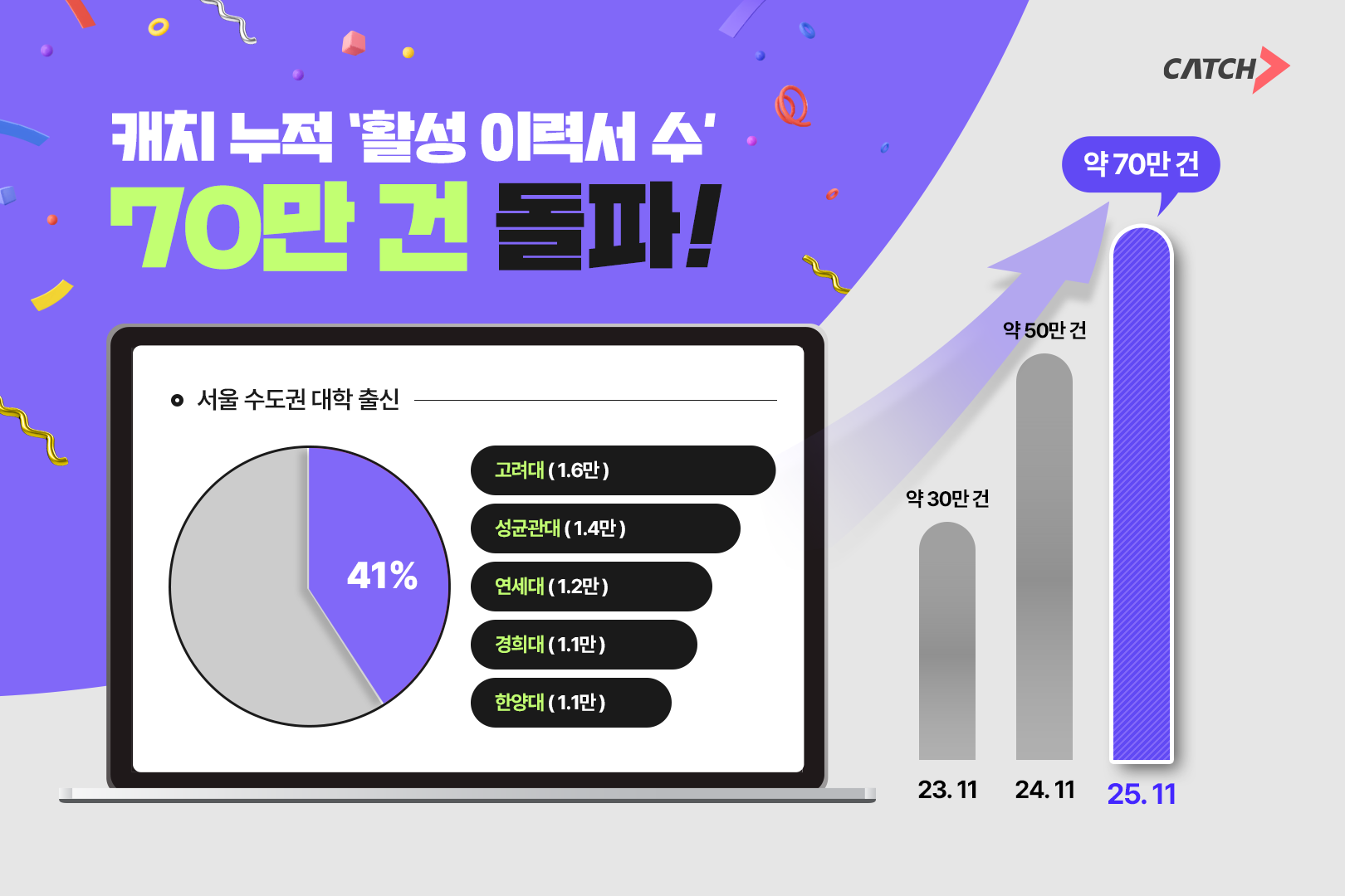 상위권 채용 플랫폼 진학사 캐치는 11월 기준 자사 플랫폼에 등록된 ‘활성 이력서’ 수가 70만 건을 돌파했다고 5일 밝혔다. 캐치 활성 이력서는 2023년 30만 건, 2024년 50만 건을 거쳐 올해 70만 건에 도달했다. 채용 한파 속에서도 1년 만에 20만 건 이상 늘어난 것으로, 가파른 증가세다.